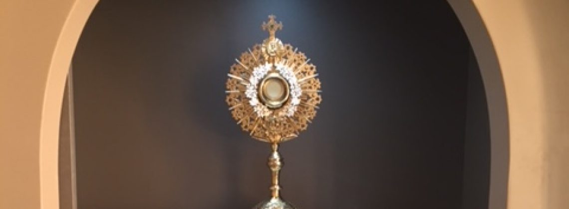 Teary and sorrowful, I entered the mostly-empty narthex of the church, only to encounter a few young music students carry instruments to and from a hallway that I had never before noticed. I entered the sanctuary, bowed to the altar and then made a quiet, solemn entry into the French doors of the day chapel. Kneeling before the monstrance which held my beloved; Jesus Christ–body, blood, soul and divinity–I whispered my usual greeting…”Dominus Est!” It IS the Lord!