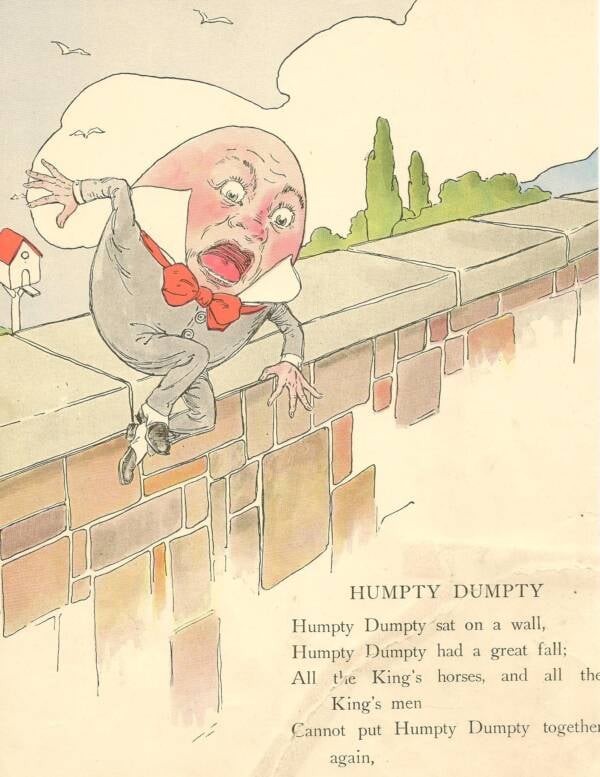 I had a friend mention that she was feeling like Humpty Dumpty lately. Fallen off the wall (presumably the one that feels steady and foundational) and feeling broken, cracked and injured and without hope.